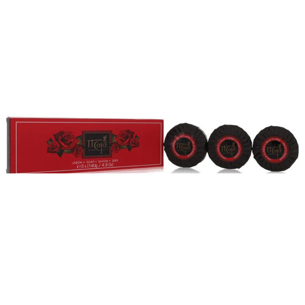 Contains 3 x 140g Perfumed SoapsMaja Perfume By Myrurgia 3 Soap Cakes is a classic, luxurious fragrance infused into beautifully crafted soap cakes. Known for its timeless, floral scent, Maja combines delicate notes of rose, jasmine, and lily with subtle hints of musk and warm vanilla undertones, creating a comforting and elegant aroma. Each soap cake delivers a gentle lather that not only cleanses the skin but also leaves a soft, long-lasting fragrance that lingers throughout the day.